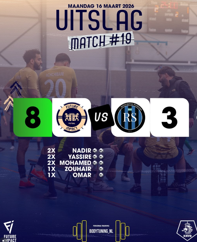 Het werd een overtuigende avond voor Future Impact Futsal, waarin het team direct de toon zette en de wedstrijd controleerde. Met verzorgd spel en veel doelgerichtheid werd een ruime overwinning geboekt.